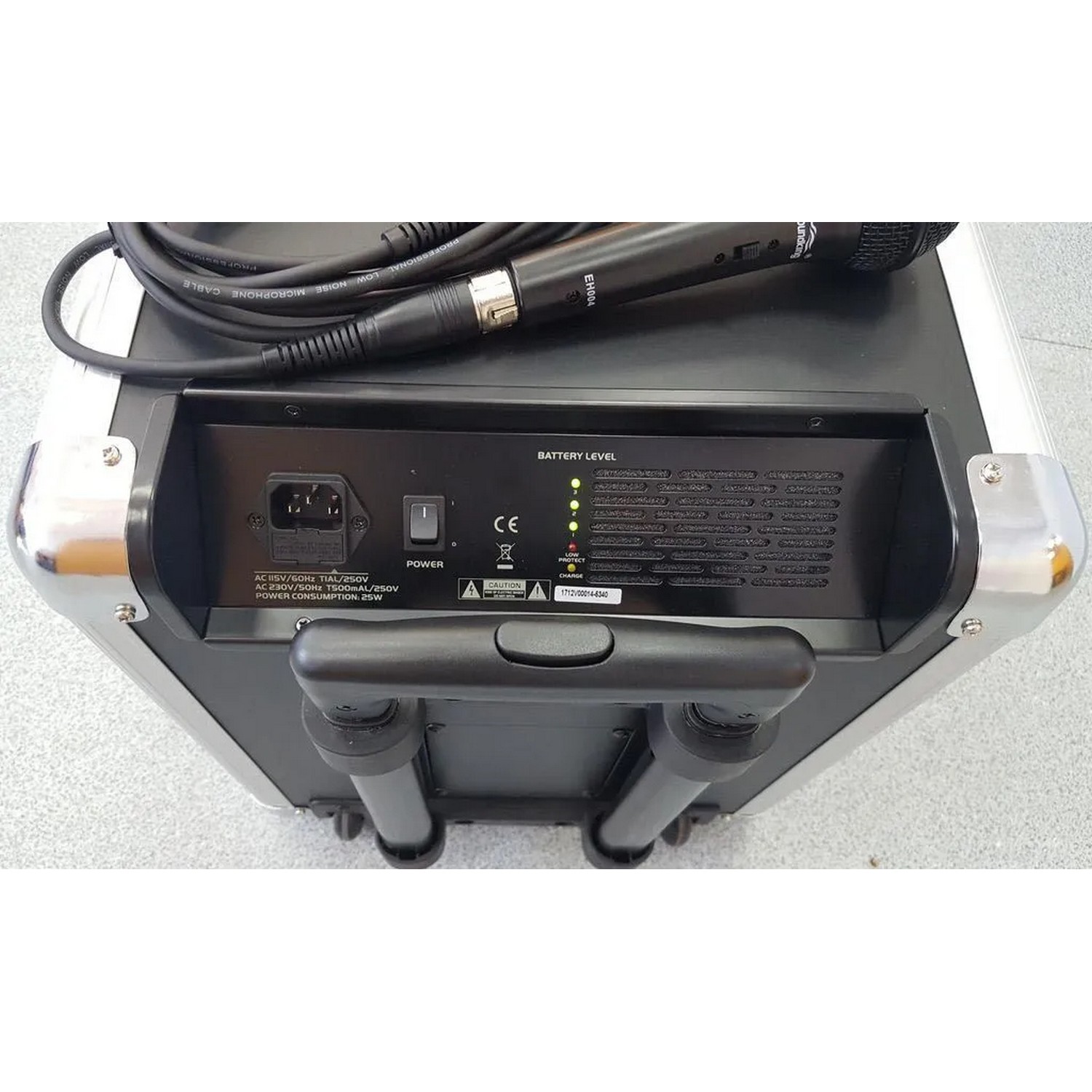 Портативная акустическая система с аккумуляторм и проводным мирофоном.