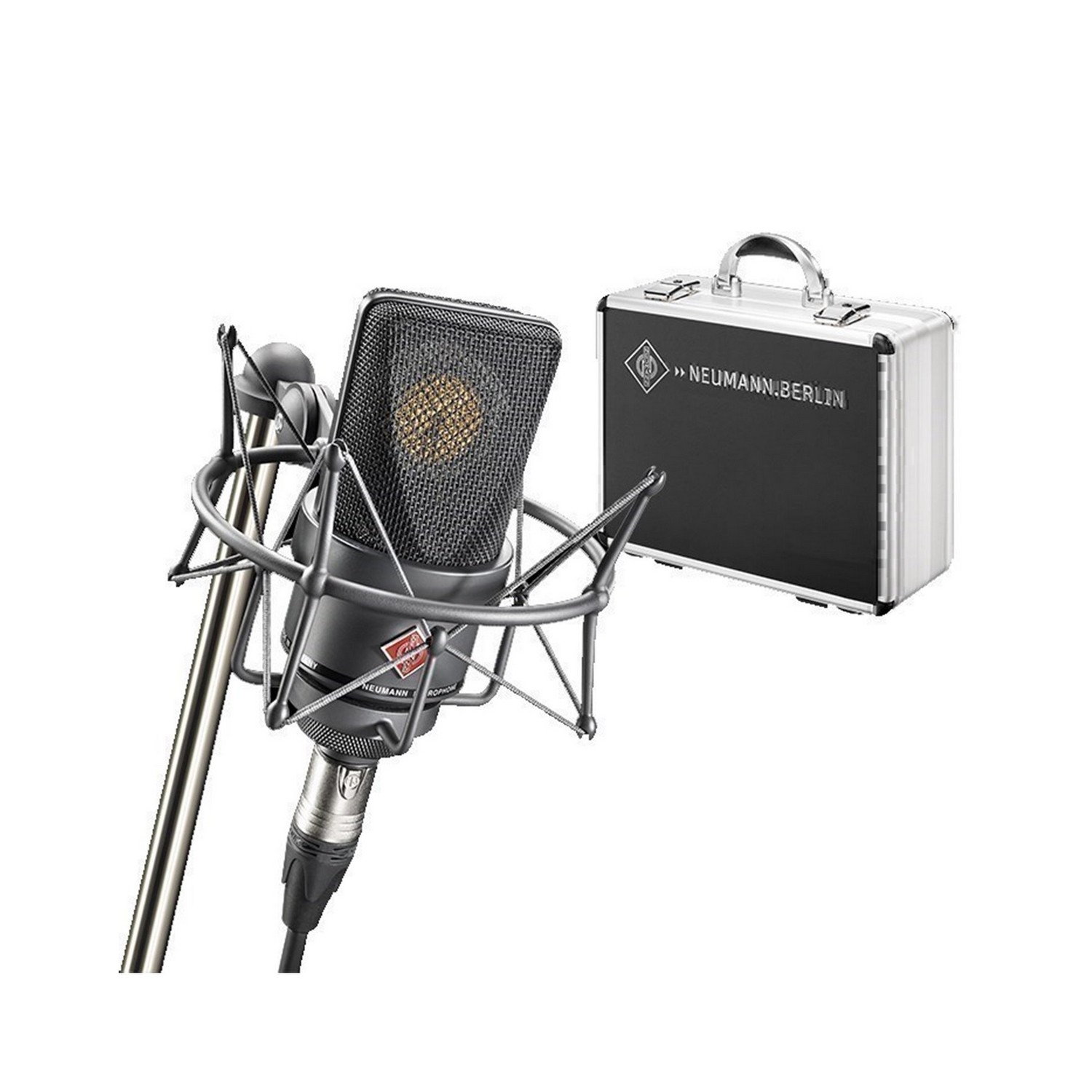 TLM 103 выпускается в двух вариантах отделки корпуса – светлой никелированной и матовой черной. В комплект поставки входят металлический шарнирный держатель SG 1 и деревянный кофр.