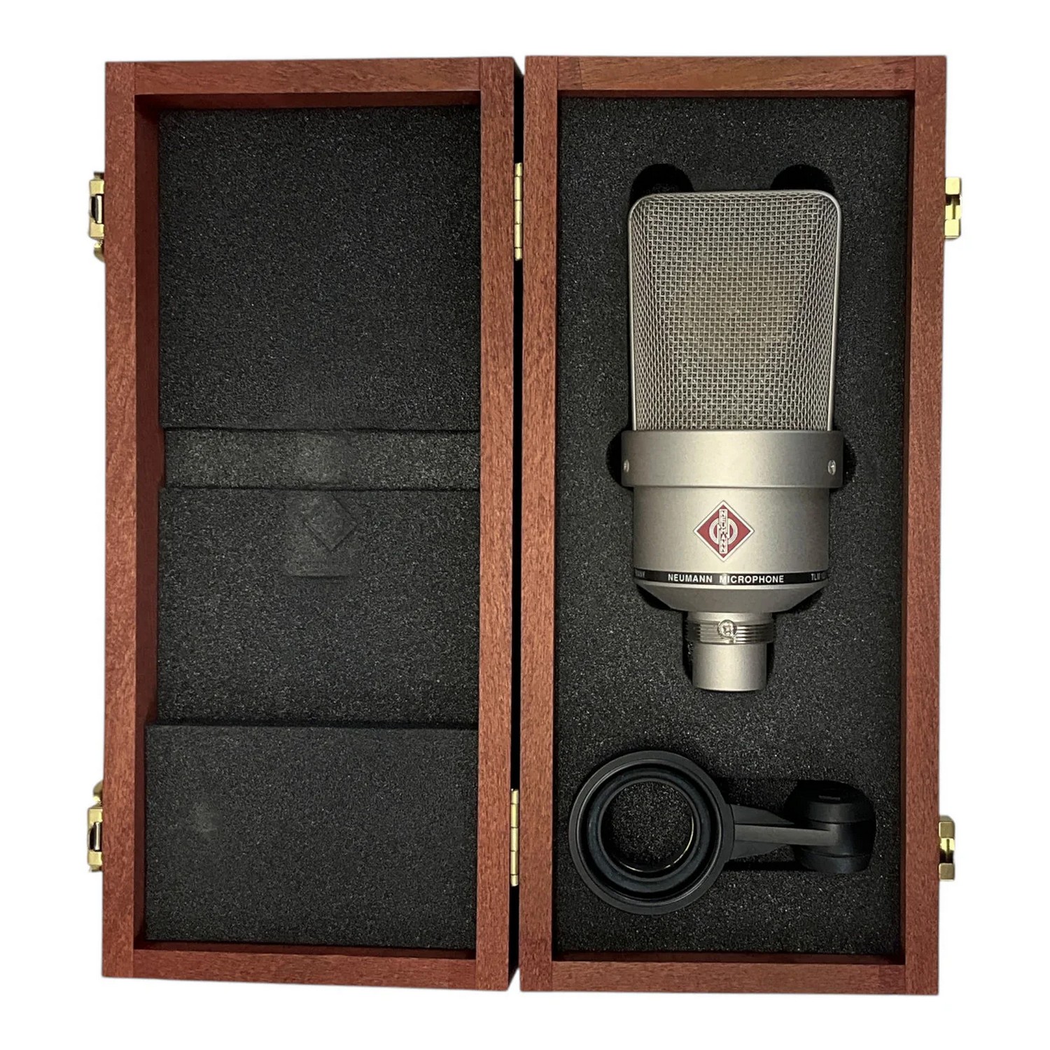TLM 103 выпускается в двух вариантах отделки корпуса – светлой никелированной и матовой черной. В комплект поставки входят металлический шарнирный держатель SG 1 и деревянный кофр.