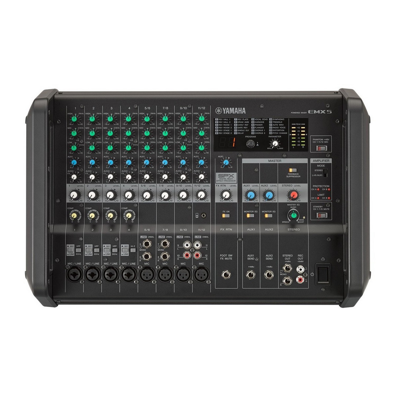 Имеющийся в EMX5 главный эквалайзер Master EQ™ с одним регулятором позволяет применить оптимизированные установки частотной коррекции, просто повернув регулятор. Установка SPEECH (Речь) адаптирована под совещания, семинары или конференции с ограничением низких частот для четкости и разборчивости речи; MUSIC (Музыка) обеспечивает более сбалансированное звучание ансамблей, играющих в «акустике» или «электричестве»; а BASS BOOST (Усиление баса) идеально подходит для выступлений диджеев или воспроизведения аудиоконтента с приоритетным акцентом на низкочастотную составляющую.