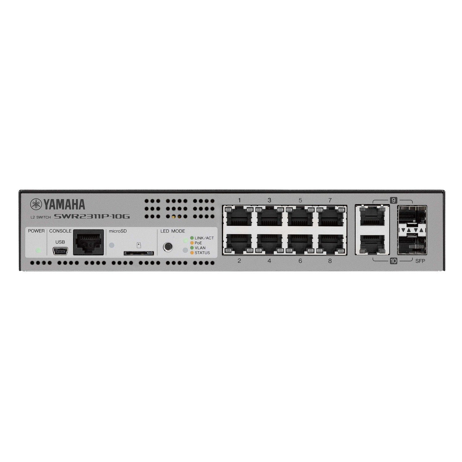 Yamaha SWR2311P-10G представляет собой интеллектуальный коммутатор второго уровня, спроектированный специально для построения профессиональных аудиосетей Dante и занимающий уникальную нишу в линейке Yamaha. Устройство оснащено восемью портами Gigabit Ethernet с поддержкой Power over Ethernet Plus, обеспечивающими питание подключенных устройств по технологии IEEE 802.3at с мощностью до 30 ватт на каждый порт при суммарном бюджете до 240 ватт на все порты . Два дополнительных порта являются комбинированными гигабитными интерфейсами LAN/SFP, которые могут работать либо как стандартные медные порты RJ45, либо как оптоволоконные порты с использованием опциональных SFP-модулей