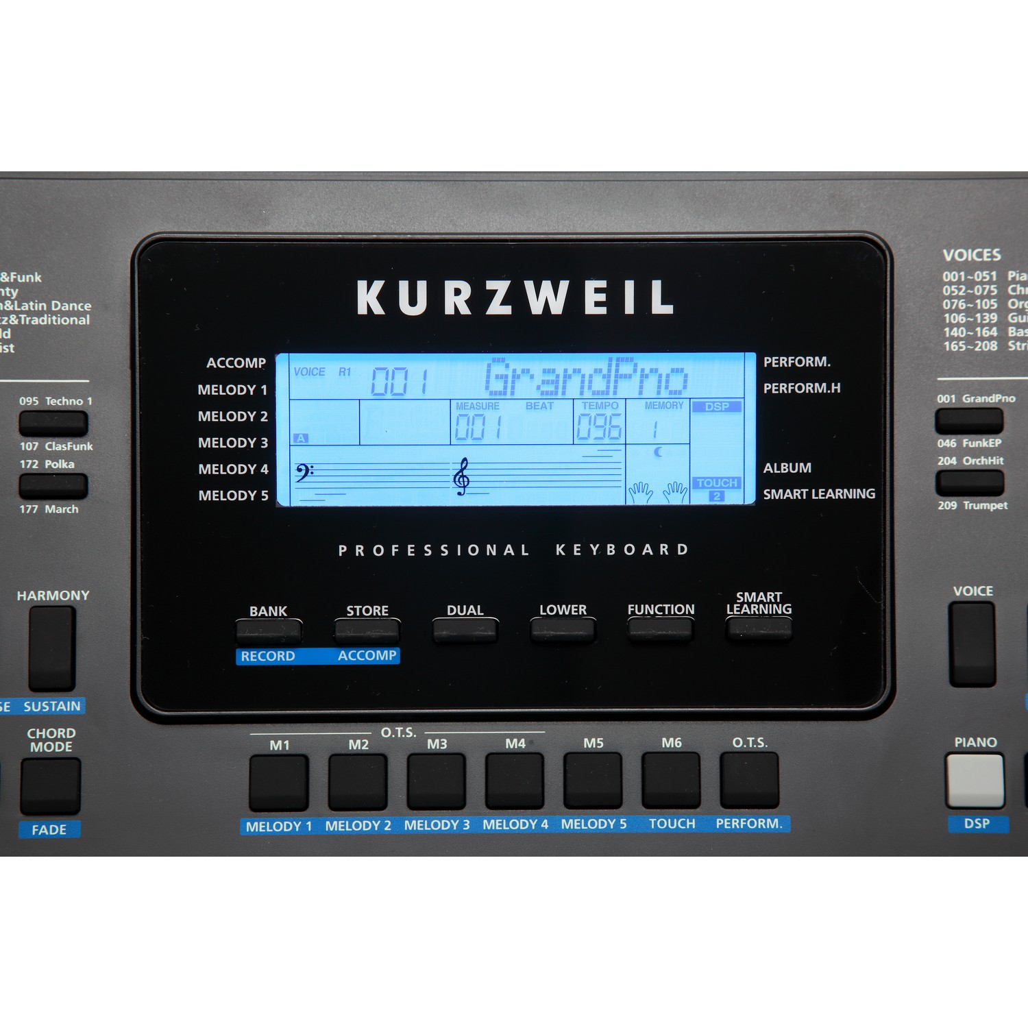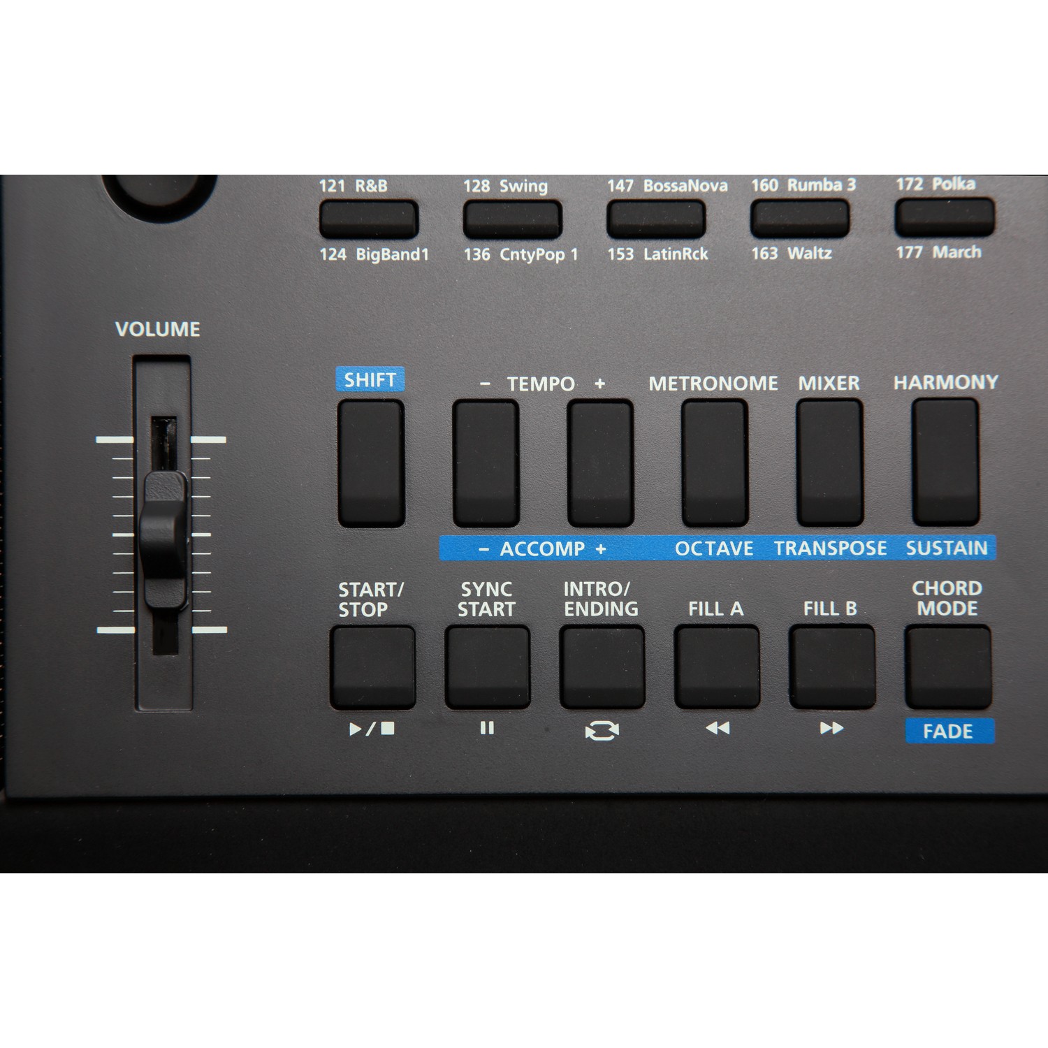 В вашем распоряжении 618 заводских звуков — от знаменитого пианино Triple Strike, через различные органы, гитары, струнные до современных синтезаторных тембров. Функция «двойной звук» позволяет одновременно смешивать два тембра, например, мягкие струнные с нежным звуком рояля, раскрывая возможность создания уникального звучания. Более 200 стилей автоаккомпанемента включают музыкальные жанры на любой вкус — от классического джаза и блюза до современных поп- и рок-композиций, что позволяет играть с полноценным музыкальным сопровождением и звучать как целая группа, не нанимая музыкантов.