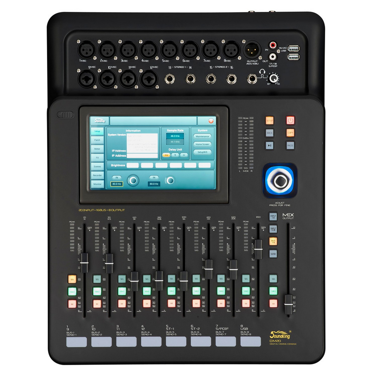 Микшерный пульт DM20 — 20 каналов, моторизированные фейдеры, большой сенсорный экран, USB порты — все что необходимо для идеального микширования в реальном времени. DM20 является результатом многолетних исследований и разработок, сочетающих опыт Soundking в обработке сигнала с использованием новейших технологий, что дает вам полный контроль над вашим звуком.